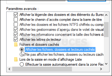 - Sélectionnez l'option Afficher les fichiers, dossiers et lecteurs cachés.